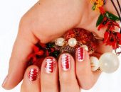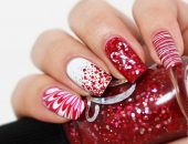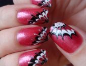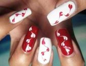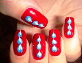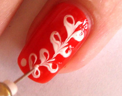 Очень красивый дизайн, узоры наносятся с помощью белого и красного лака. Точки ставятся специальным инструментом — дотсом.